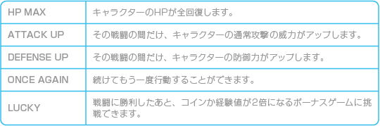 敵を倒したキャラクターは、ときどき「ボーナスフラワー」をもらえることがあります。ボーナスフラワーの効果は5種類あり、倒した敵の種類によって異なります。 |