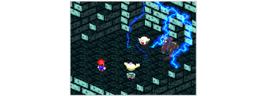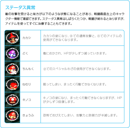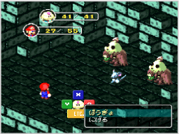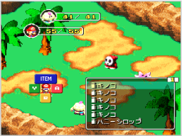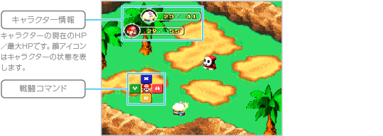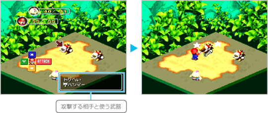 戦闘では、4つのボタンのいずれかを押してコマンドを選び、マリオや味方の行動を決めます。なお、戦闘コマンドは同じボタンを押していくと決定となり、違うボタンを押すとキャンセルされます。 |