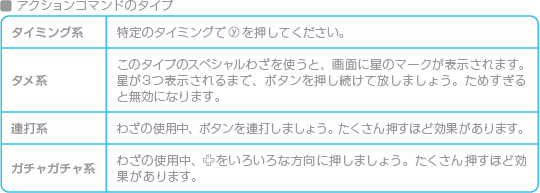 スペシャルわざを使う際のアクションコマンドはわざによって異なり、成功時の効果もさまざまです。スペシャルわざのアクションコマンドがどのタイプなのかを調べるときは、メニューの「スペシャル」を見てください。 |
