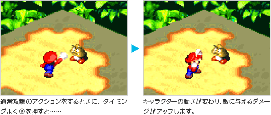 通常攻撃とスペシャルわざを使うときや、敵から攻撃されたときには、「アクションコマンド」を入力できます。アクションコマンドとはそれぞれの行動ごとに決められた操作のことで、成功すると攻撃が強力になったり、効果がアップします。 |