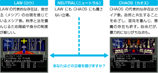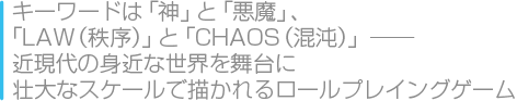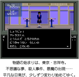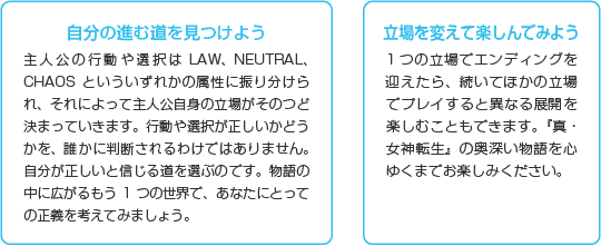 | 一般的な「神」「悪魔」のイメージと「善=味方」「悪=敵」という考え方を取り払い、「LAW」と「CHAOS」という概念のもとに物語を進める、画期的なRPG『真・女神転生』シリーズ。その第1弾が、1992年10月30日に発売された本作です。「LAW」と「CHAOS」にはそれぞれ神がいて、どちらが善でどちらが悪だと最初から決められているわけではありません。主人公を操るプレイヤーの判断と行動によって、戦うべき相手、そして物語の結末が変わっていくのです。何が正しくて、何が間違っているのか、立場や状況によって変化するこの答えを、あなた自身の手で見つけてください。 | ![]() |