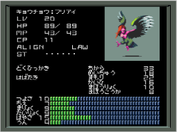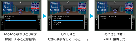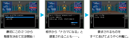 | 敵として現れる悪魔は、話しかけて交渉することにより、仲魔(仲間の悪魔)にすることもできます。仲魔は2〜3体を合体させることができるので、いろいろな組み合わせを試して、強い仲魔を生み出しましょう。 | ![]() |