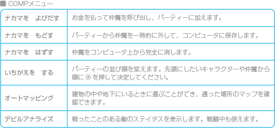 主人公がコンピュータを使います。 なお、「オートマッピング」と「デビルアナライズ」は、物語が進み、各プログラムを手に入れると表示されます。 |