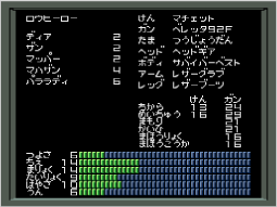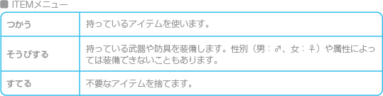 持っているアイテムを使ったり装備します。武器や防具は持っているだけでは効果がないので、必ず装備しましょう。 |