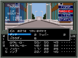 仲魔を呼び出したりアイテムや魔法を使うなど、キャラクターや仲魔たちへの指示はコマンドで出すことができます。 |