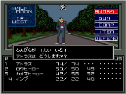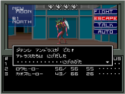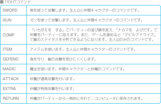 主人公と仲間キャラクターは「SWORD」、仲魔は「ATTACK」で自動的に戦います。戦いは、敵か味方、どちらかが全滅するまで続けます。手動でコマンドを選ぶときは、 |