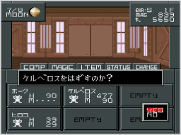 選んだ仲魔をCOMPからはずします。はずした仲魔は、戦闘で仲魔にするか、悪魔合体で作り直さないと、元に戻らないので注意してください。 |