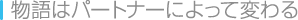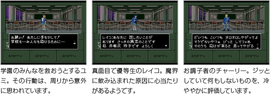 主人公は「ユミ」「レイコ」「チャーリー」の誰かとともに行動します。誰がパートナーになるのかはゲーム序盤の進めかたや選択によって変わり、パートナーによって物語が大きく変わります。 ![]() |
