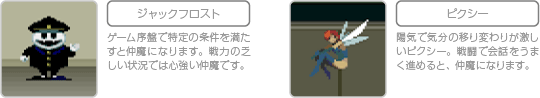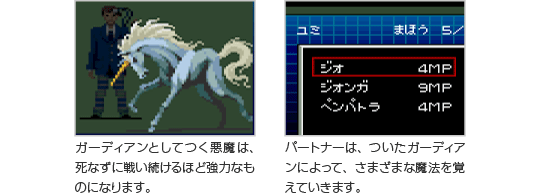 主人公やパートナーが戦闘で死亡すると、ガーディアンと呼ばれる悪魔が守護としてつき復活します。ついたガーディアンによって、能力が変化したり、使用可能な魔法などが変わります。 ![]() |