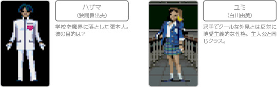 ある日、学校が魔界に飲み込まれてしまった。 それはある一人の生徒によってひき起こされた現象であった。 彼は天才的な頭脳の持ち主であるが、先天的に他者とのコミュニケーション能力に欠け、 凡俗との交流を半ば無意識的に絶ってきたために常に孤独な存在であった。 そして彼の思想、ポリシーには選民思想につながる危険なものがあった。 彼は偶然手にした悪魔召喚プログラムを使って、悪魔を召喚し始め、魔界の存在を知るようになる。 そして魔界を自分の力で自由自在に操れることを悟る。 魔界を支配できるようになると、学校を魔界に引きずり込んでしまうのであった。 この魔界から脱出すべく主人公は立ち上がるのだが…。 ![]() |