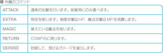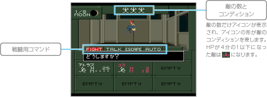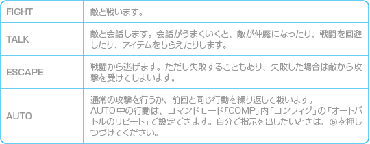 ※敵と同じ仲魔がいるときに「TALK」を選ぶと、戦闘を回避できます。 |