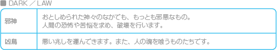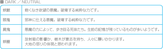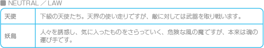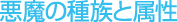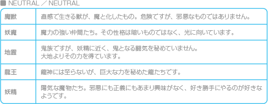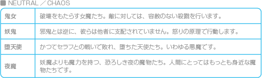 悪魔の属性は、「LIGHTとDARK、その中間のNEUTRAL」と「LAWとCHAOS、その中間のNEUTRAL」の組み合わせで表されます。また、種族ごとに属性の組み合わせが決まっています。