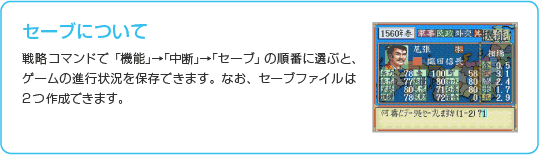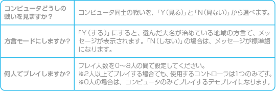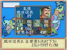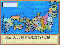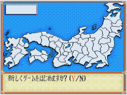 大名を選ぶと初期能力値がランダムに決まります。OKの場合は「Y」を、もう一度決め直す場合は「N」を選んでください。続いてコンピュータの強さを、1(弱い)〜5(強い)から選ぶとゲームが始まります。 ※大名の名前を、漢字で姓を3文字、名を2文字以内で変更することもできます。使用したい漢字の「音読み」の1文字目を選び、漢字一覧から文字を選んでください。 |