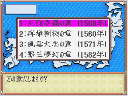 まず、シナリオを4つのなかから選んでください。日本全国(50ヵ国)を制覇することがゲームの勝利条件ですが、「1:列強争覇の章」のみ東海地方と近畿地方の17ヵ国を制覇できると勝利となります。 |