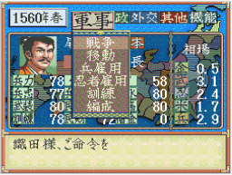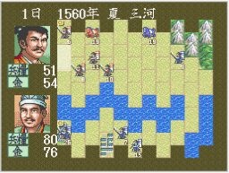 ほかの大名が支配する国に「戦争」を挑んだり、ほかの大名の手番中に自国に攻め込まれたり、大名の本国で謀反や一揆が起こると、戦争画面に移って戦争が始まります。部隊にさまざまな命令を出して戦ってください。勝利した側は国を支配できます。 |