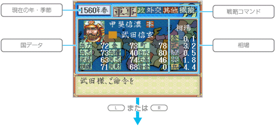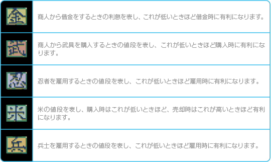 相場とは商人と取引したり、兵士や忍者を雇うときの値段で、これらの取引を行うたびに変動します。なお、毎年春になると、その年の基本相場が決定されます。