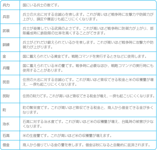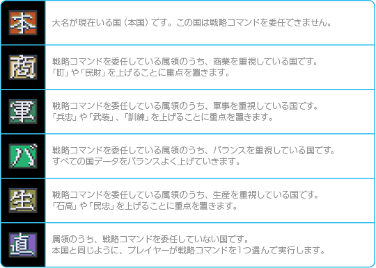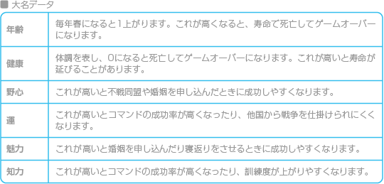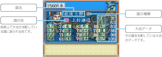 大名データは、戦略コマンドで「其他」→「情報」→「自国」または「他国」の順に選んだ場合に表示されます。