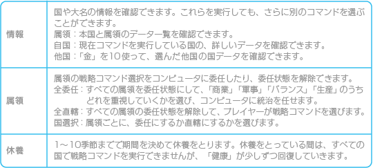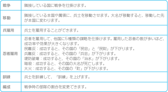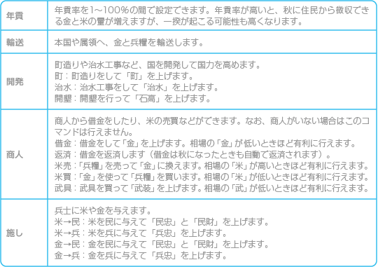 国の開発や商人との取引などの内政を行うコマンドです。 |