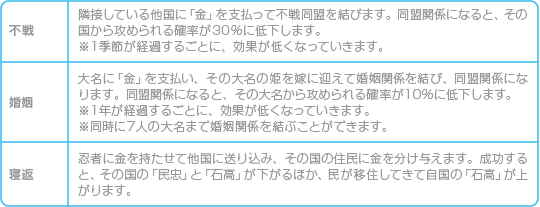 不戦同盟や婚姻などで同盟関係を結んだり、他国の住民を寝返らせる外交を行うコマンドです。 |