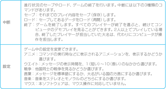進行状況のセーブやゲームの終了、ゲーム設定の変更などができます。 |