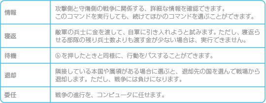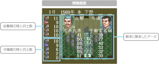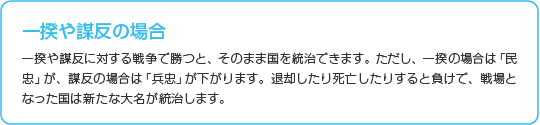 攻撃側が勝った場合は、戦場となった国を手に入れることができます。大名自身が戦争に参加していた場合は、その国が本国になります。守備側が勝った場合は、戦争終了時に攻撃側が残した兵士と兵糧、金を手に入れます。なお、どちらの場合でも大名が死亡したときは、その大名が治めていた本国と属領をすべて手に入れることができます。 |
