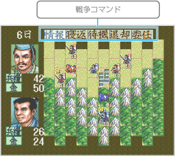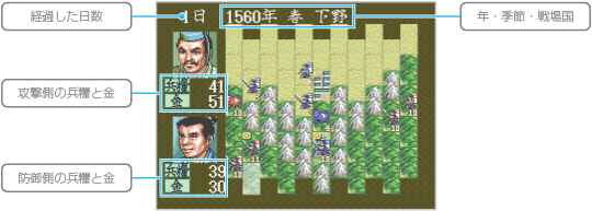 戦争では、まず守備側が第1部隊〜第5部隊の順番に行動し、次に攻撃側が第1部隊〜第5部隊の順番に行動します。すると1日が経過し、兵糧が少し減って次の日になります。 |