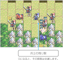 部隊の配置が完了すると戦争が始まります。 それぞれの部隊に移動や攻撃をさせて、相手の部隊を全滅させましょう。 |