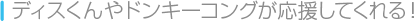| ゲームはシンプルですが、ちょっとしたお楽しみもあります。ディスクシステムのキャラクター「ディスくん」が声援を送ってくれたり、おなじみ「ドンキーコング」が観客席で応援してくれたり……。そのかわいらしい姿に、思わずヤル気になっちゃうかも!? | ![]() |