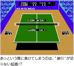 | 1987年5月30日、本ソフトはディスクシステム用ゲームとして発売されました。 プレイヤーの動きは手とラケットのみで表現され、ごくシンプル。勝っても負けても派手な演出はありません。 シンプルに作られているからこそ、ピンポンのおもしろさが際立ち、本物のピンポンで遊んでいるときのような、勝ったときのうれしさと、負けたときのくやしさを味わえるゲームなのです。 |