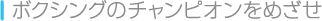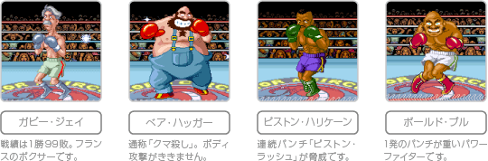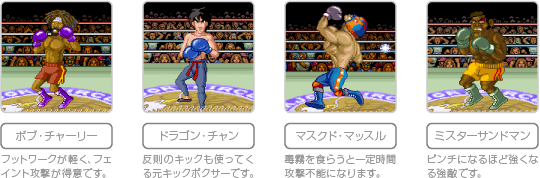 「ボディ攻撃がきかない」、「すばやい動きが得意」など、対戦相手はいずれもひとクセあります。対戦相手たちの特徴や攻撃パターンを見切って、パンチをたたき込んでください。 ![]() ![]() |