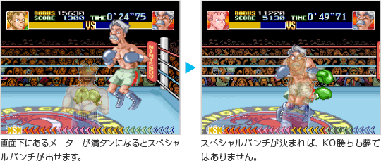 対戦相手にパンチを当て続けていると、スペシャルパンチと呼ばれる強烈なパンチが出せるようになります。まさに決め技と呼ぶにふさわしい威力があるので、スペシャルパンチが使える状態になったら積極的に使ってください。 ![]() |