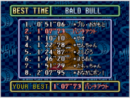 世界の頂点に立っても挑戦は続きます。 タイムアタックモードでは対戦相手を選び、どれだけ早く相手を倒せるかに挑戦できます。なお、好成績が出るとレコードに名前が載ります。 |