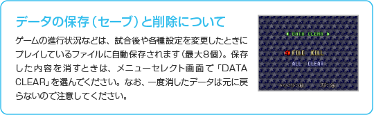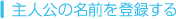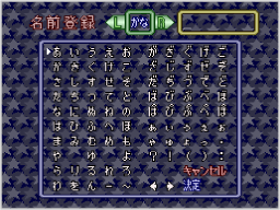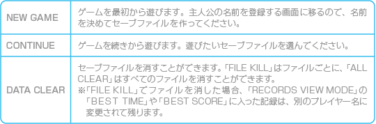 メニューセレクト画面で「NEW GAME」を選んだ場合は、主人公の名前(最大8文字)を登録し、新しいセーブファイルを作ります。