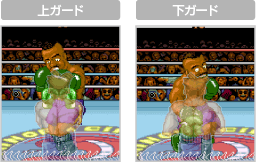 腕を上下させ、グローブで相手のパンチを防ぎます。 上ガードは顔のガードで なお、ガードの通用しない威力の大きいパンチもあります。 |
