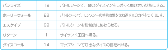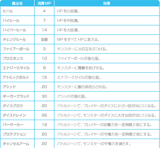 攻撃魔法や回復魔法のほか、移動が楽になる魔法などがあります。キャラクターによって使える魔法や習得レベルが異なります。