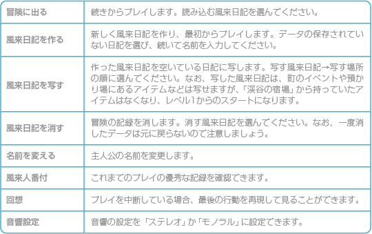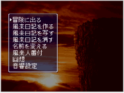 ※初めてこのゲームで遊ぶときは「風来日記を作る」「風来人番付」「音響設定」のみ表示されます。