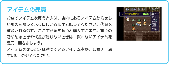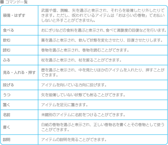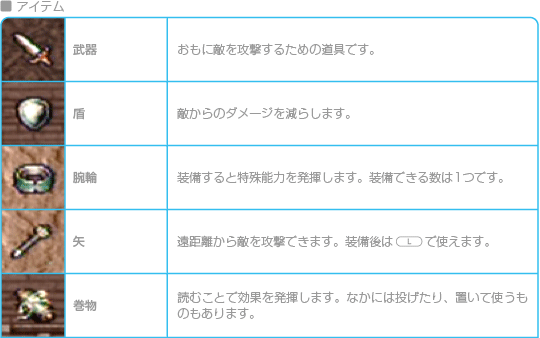 基本ウインドウの「道具」を選ぶと、持っているアイテムの一覧が表示されます。アイテムを選ぶとコマンドが表示されるので、必要に応じて装備を交換したり、アイテムを使ったりしてください。なお、アイテムウインドウ表示中に