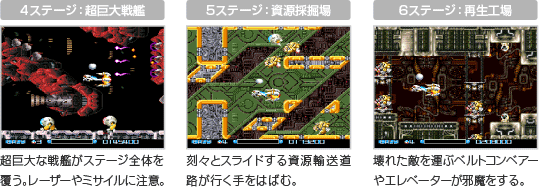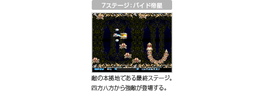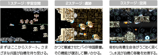 敵の本拠地であるバイド帝星にたどり着くためには、さまざまなステージを突破する必要があります。宇宙空間に始まり、かつての帝国要塞、謎の生き物がひそむ空洞など、多彩なステージがプレイヤーを待ち受けます。なかにはステージそのものに大がかりな仕掛けが用意されていることも……。これらの手強いステージをくぐり抜けたときの喜び、ぜひとも味わってみてください。