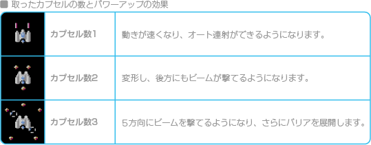 3段階までパワーアップすると、シーザーは周囲にバリアを展開します。 このバリアは最大5発まで敵の攻撃に耐えることができます。さらに、バリア展開中に「パワーカプセル」を取ると、空中にいる敵を全滅させることができます。 なお、バリアは敵の体当たりを防ぐことはできません。また、バリアが敵の攻撃を1発でも受けた時点で、シーザーのビームは「カプセル数2」と同様のものにもどります。 |