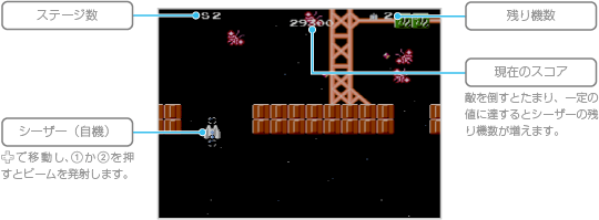 敵にぶつかるか敵の攻撃に当たるとミスとなり、残り機数が1つ減って特定の地点からやり直しとなります。残り機数が0のときにミスするとゲームオーバーとなり、 |