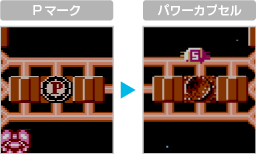 浮遊大陸上にある「Pマーク」を撃つと、「パワーカプセル」が飛び出します。これを取ると、シーザーが3段階までパワーアップします。 |