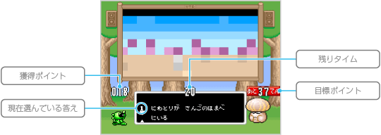モザイクでぼやけている絵を見て、キャラクター名や何をしている場面なのかを当てるゲームです。 ![]() |