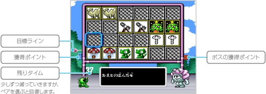 コースの途中や最後にはボスが登場し、「モザイク当て」「しりとり」「神経衰弱」「数字さがし」のいずれかで対決します。なお、一度クリアしたボスとは、再戦することができません。