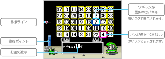 ランダムに並んでいる、最大で1〜40までの数字が書かれたパネルのなかから、お題の数字が書かれたパネルを見つけるゲームです。 ![]() |