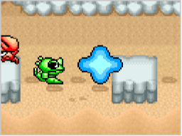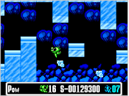 挑戦できるコースのなかには、氷で覆われたものがあります。足場が滑って移動しにくいうえに、音波砲が敵に効かないので注意してください。 なお、このコースでは、音波砲を凍らせて足場をつくることができます。うまく使って敵を避けることが攻略のポイントです。 |