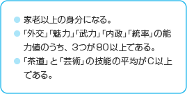 ゲーム序盤は、自分の城を持って城主になることをめざします。評定に参加し、さまざまな主命(仕事)を引き受けたり、武将や茶人などに師事して技能を上げてください。以下の3つの条件を満たすと、城主になることができます。 ![]() |