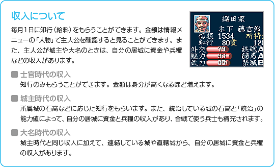 主人公は、大きく分けて「士官」→「城主」→「大名」の3段階で出世していき、段階ごとに目標が変わります。また、城主になるには、大名からの信頼を得て「身分」を上げていく必要があります。 |