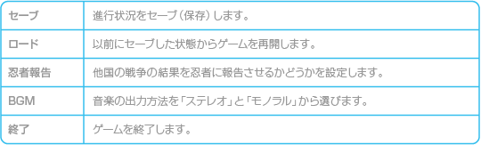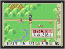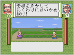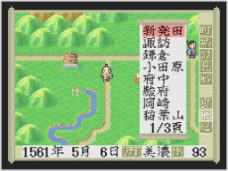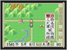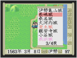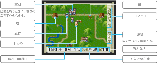 町や城などに着くと、中に入ることができます。他国の武将に戦いを挑んだり、戦いを挑まれると個人戦になります。また、軍団同士が戦うときや他国の城を攻めたときは、合戦になります。 ![]() |