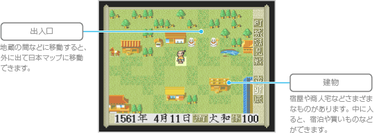 メイン画面は主人公を移動させる画面です。日本マップと町マップの2種類があります。 |