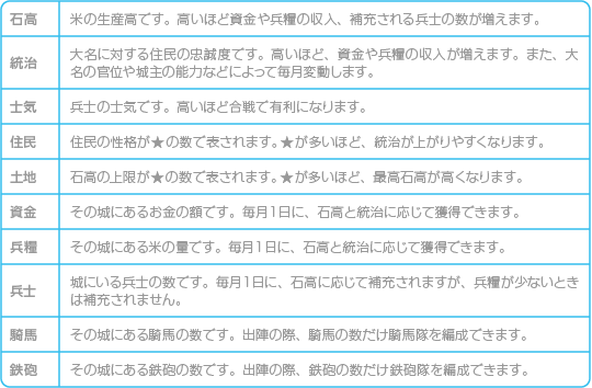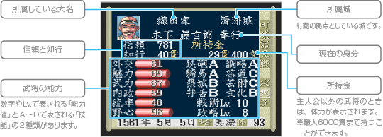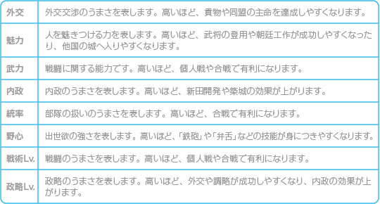 武将の基本的な能力を表します。主命を達成したり、個人戦や合戦を行うと、変化していきます。 ![]() |